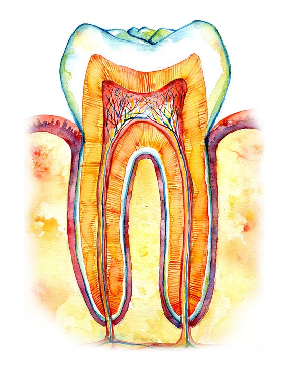 Tooth Bone And Gingiva Watercolor Print Abstract Dental Anatomy Art Print Molar Cross Section Watercolor In Orange